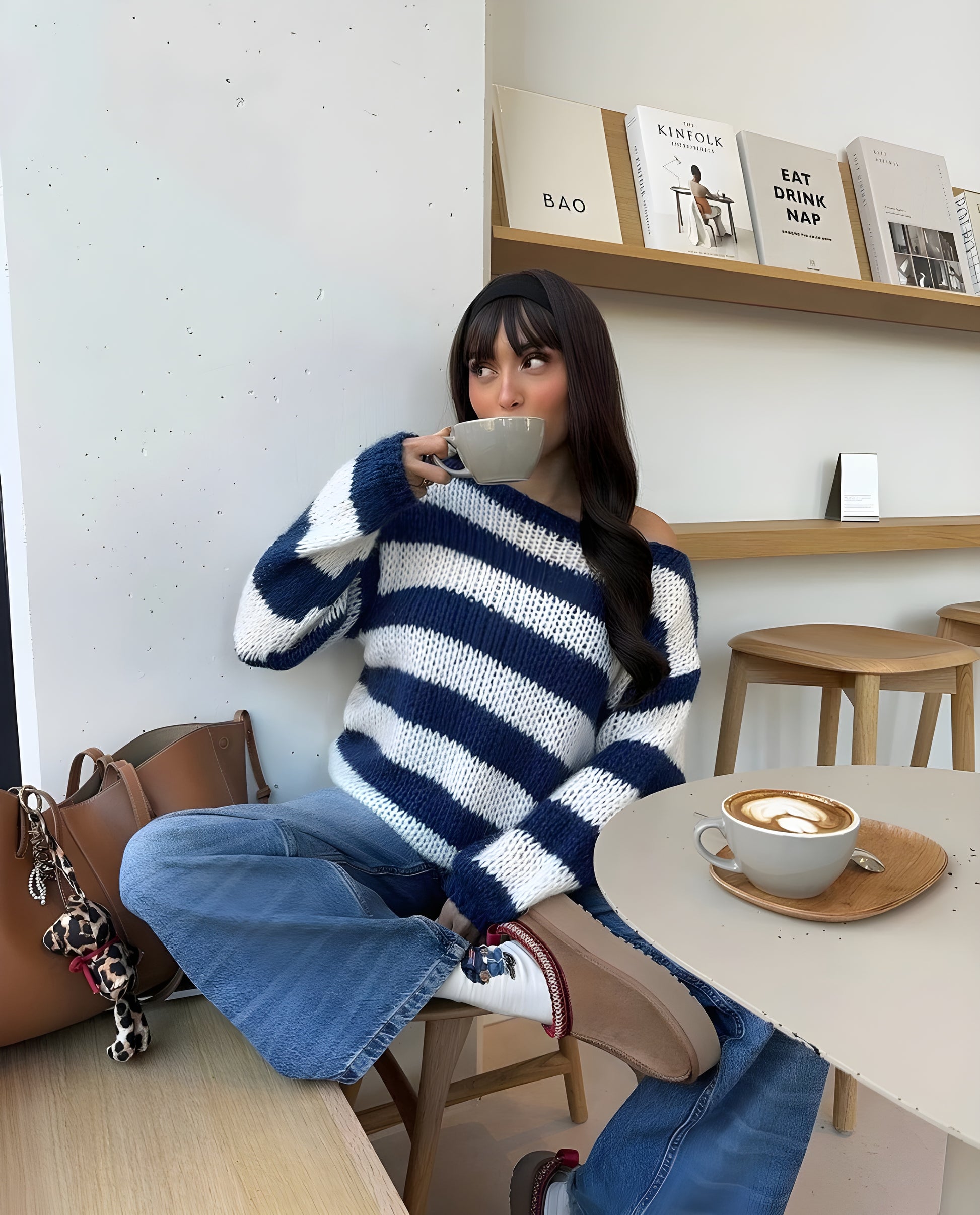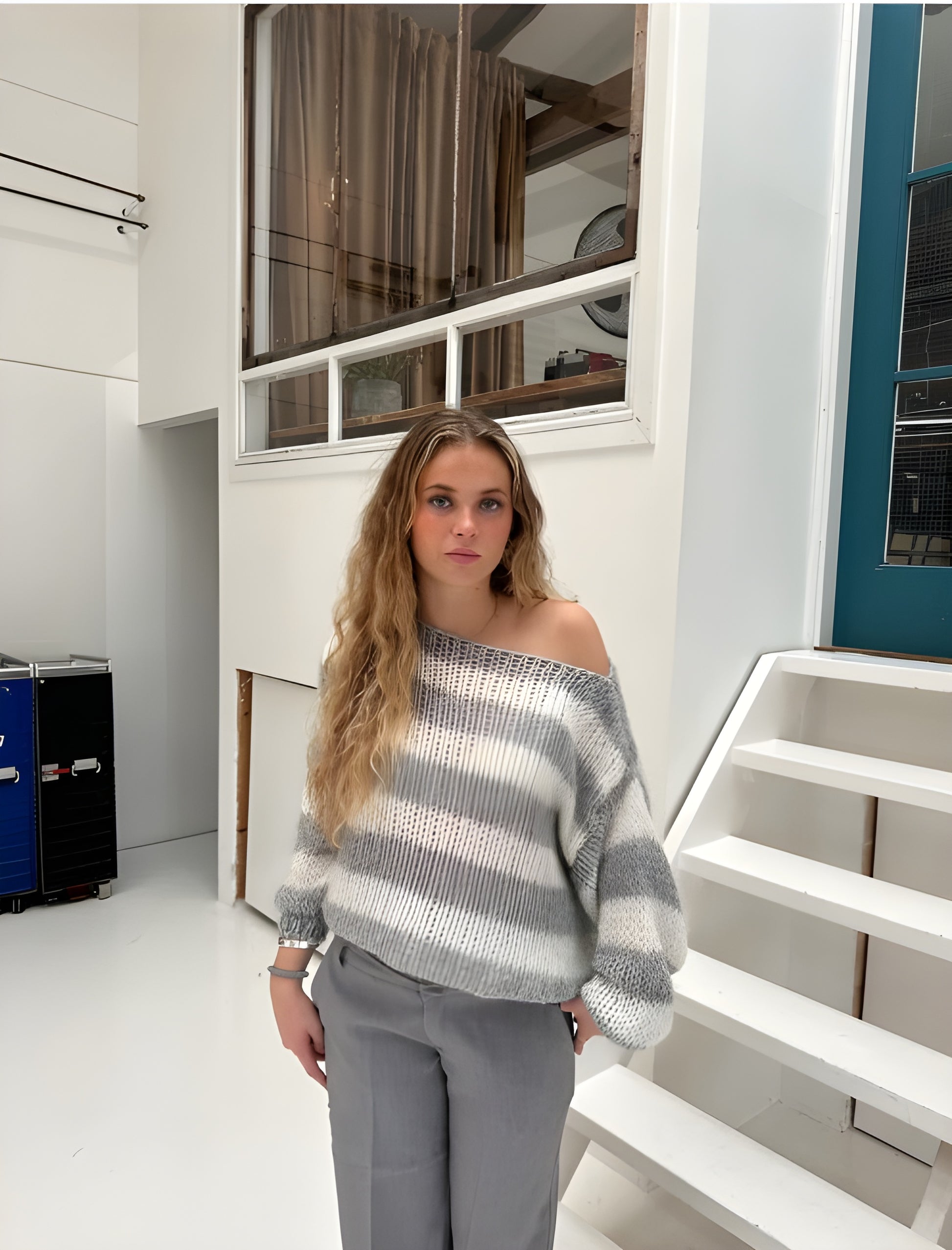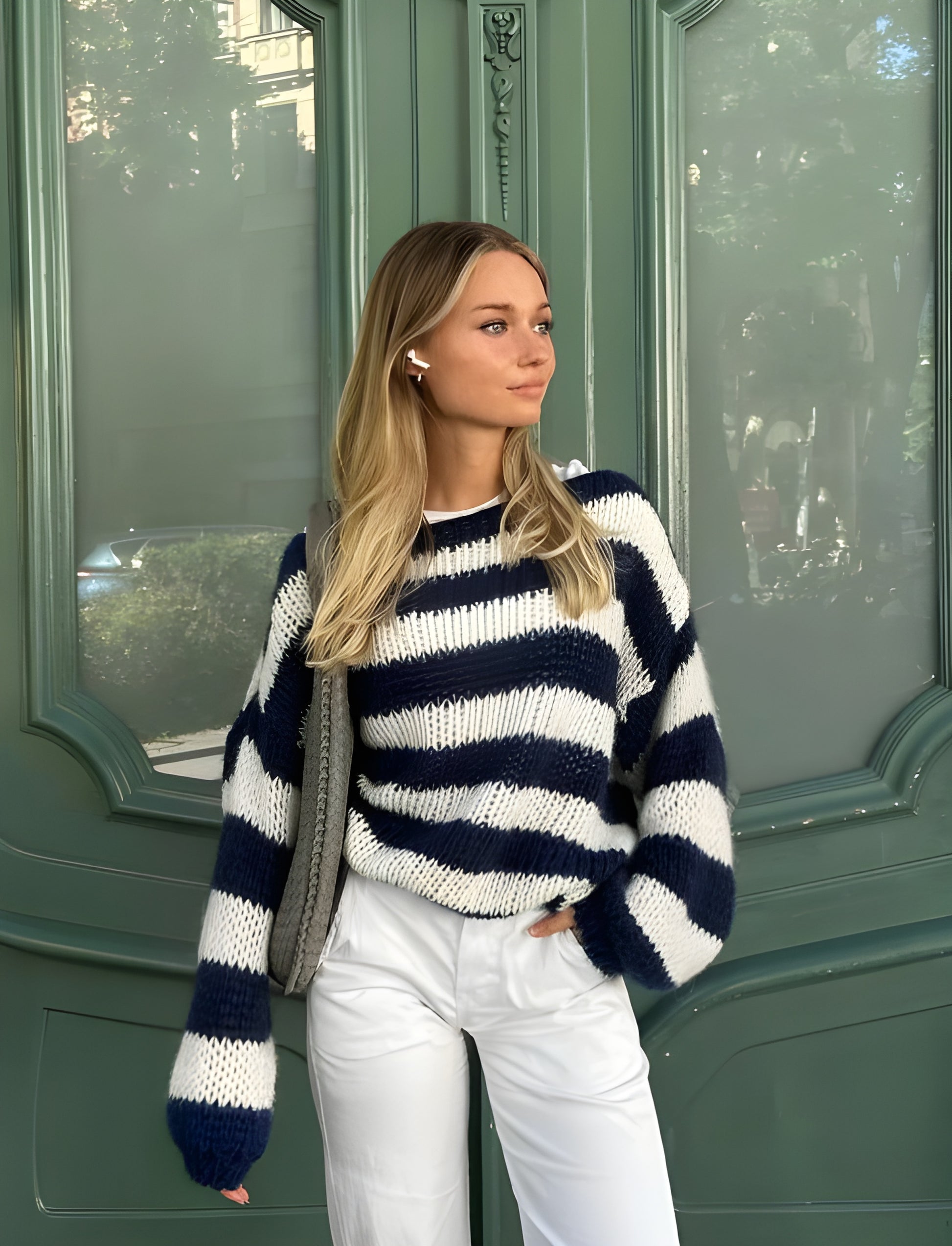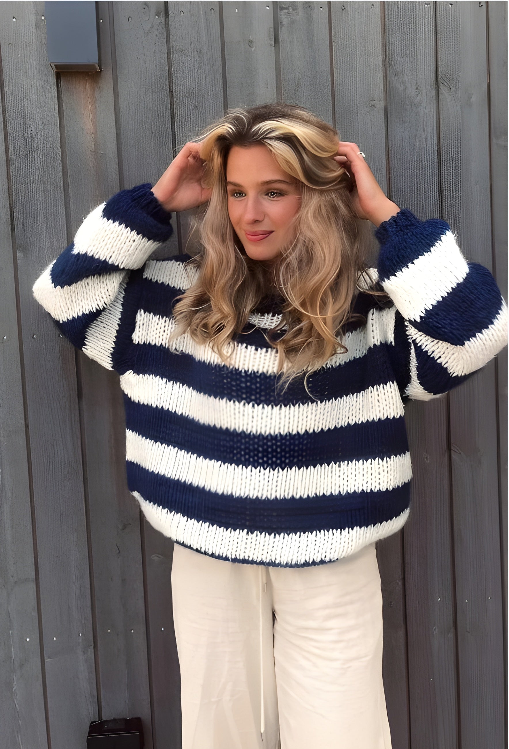 Föreställ dig ett plagg som finner den perfekta balansen mellan ultimat komfort och ansträngningslös elegans: varje modern kvinnas dröm. Möt vår ikoniska Alva Tröja, en blå- och vitrandig tröja, designad med en modern oversized-passform. Alva Tröja är inte bara en tröja; det är ett uttryck för avslappnad elegans, en ny hörnsten i din garderob som du helst aldrig vill ta av dig.