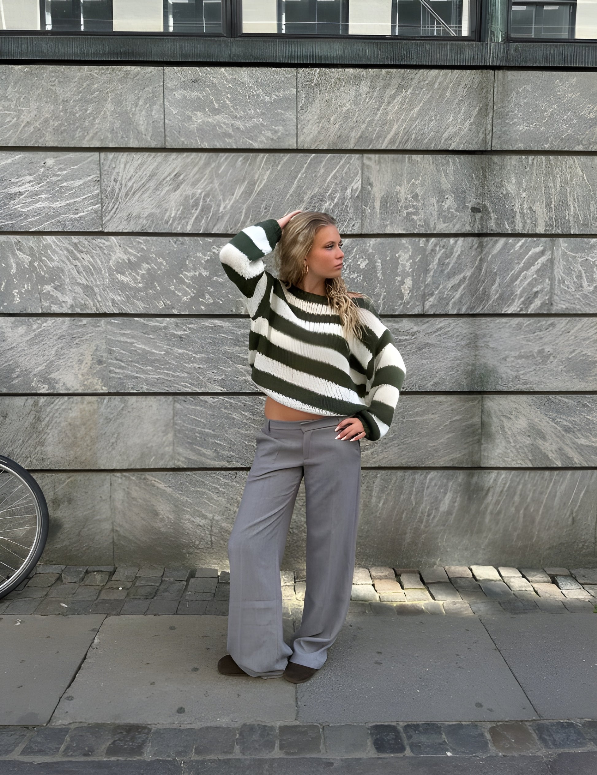 Du känner igen de där morgnarna: garderoben är full, men du har inget att ha på dig. Alva Tröja är lösningen. Det klassiska bretonska randmönstret i kombination med den avslappnade oversized-passformen skapar en look som är både tidlös och trendig. Bär Alva Tröja löst över dina favoritjeans för en ledig helglook, eller skapa en lekfull silhuett genom att kombinera den med smala byxor. Du ser alltid modern ut, med minimal ansträngning.